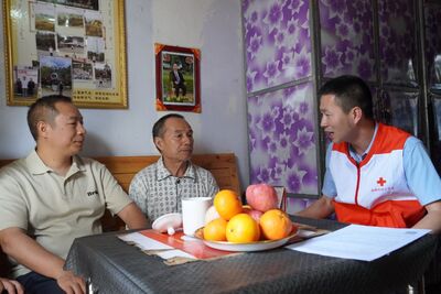 下午2时30分许,红十字志愿者和爱心人士组成的慰问组来到河市镇河东村二期安置房杨焕国家中。杨焕国患肺气肿病多年,长期吃药,夫妻二人均年过六旬,其独子不幸在江西车祸遇难后,无偿捐献器官。志愿者们详细询问其身体状况和生活难题,告诉他红十字会作为党和政府在人道领域联系群众的桥梁和纽带,不会忘记他曾经为需要帮助的人献出的爱心,在他需要援手的时候,将持续把爱与被爱传递下去,并鼓励他坚强面对困境,保持乐观心态,积极面对生活,随后爱心人士送上慰问心意。