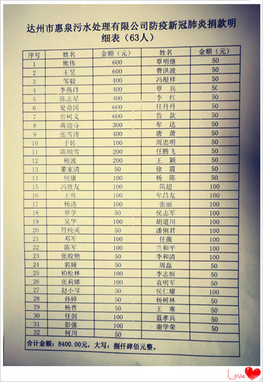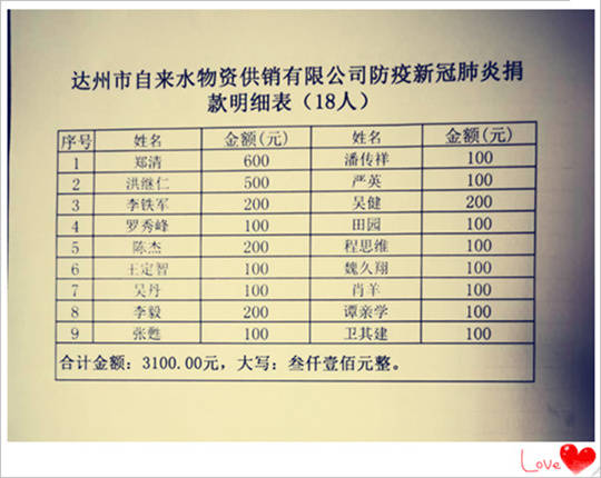 2月26日,达州市红十字会收到达州水务集团和公司干部职工捐款606915元,(其中达州水务集团以公司名义捐赠500000元,集团及所属子公司干部职工捐款106915元)。
